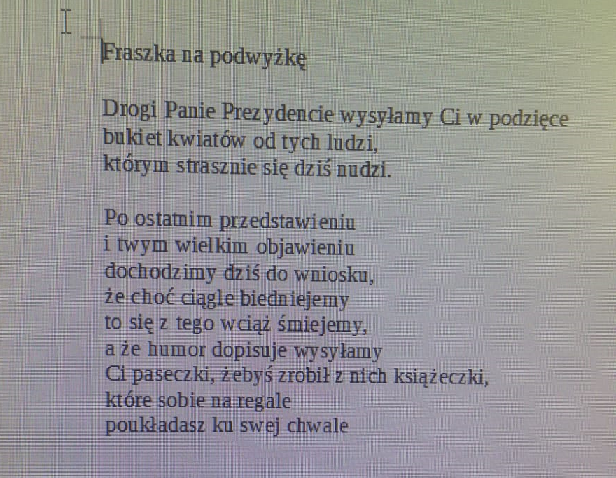Teraz także pracownicy postanowili zareagować na przekaz medialny ratusza, a w szczególności na informację, że "powinni być wdzięczni za podwyżkę, którą otrzymali". Strona społeczna postanowiła przekazać prezydentowi zakupiony z "podwyżek" bukiet kwiatów (na droższy prezent środków nie starczyło), wraz z odcinkami pensji pracowników, by uzmysłowić dlaczego nadal walczą o godne wynagrodzenie za niełatwą i niedocenioną pracę. Do bukietu dołączono także fraszkę, o poniższej treści: